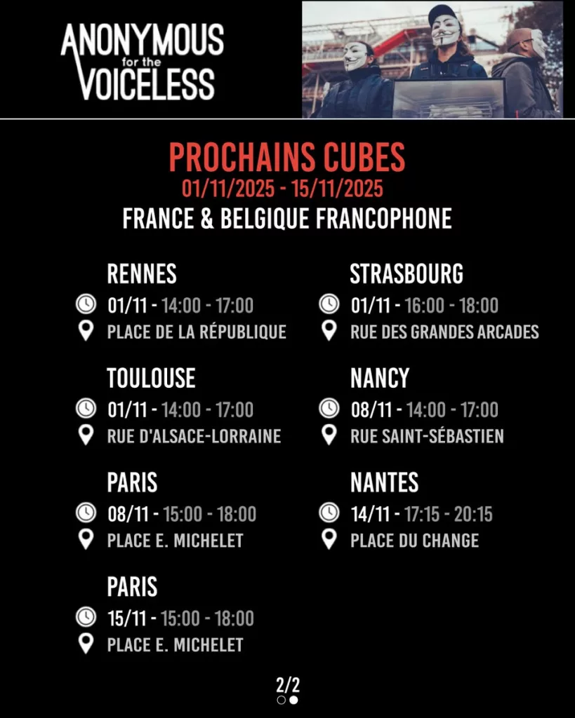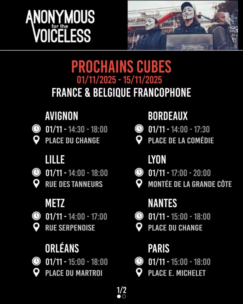 Le Cube de Vérité est une campagne de sensibilisation de rue qui utilise une action directe auprès du public, de manière structurée. Nous utilisons des séquences de pratiques standard affichées sur des écrans pour exposer la vérité sur l’agriculture animale au public et des conversations individuelles pour les informer sur l’exploitation animale. |